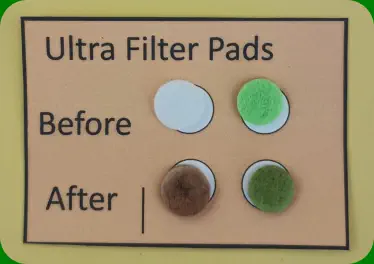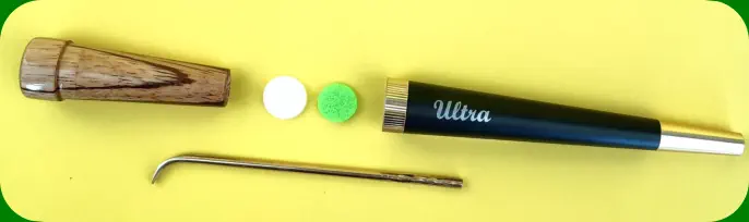 Themetalbarrelisespeciallydesignedtoaccommodatetwospecialcottonfilterdisks.Lookingintothelargeendofthebarrel,youwillseeastainless-steelscreenaboutthreequarterinchinside.Thisscreenservesasaparticlefilterandsupportforthefilterdisks.Itisprettymuchmaintenancefree,butcanberemoved/replaced asneeded.Removeitbyunscrewingmouthpiece,insertthepicktoolintothebarrelandgentlypushthescreen out.Toreplacethescreen,placeitatopbarrel’slargeendopening.Gentlyandevenlypressitintothebarrel.UsingthepicktoolorendofsomethinglikeaSharpiemarker,pushitdownontotheridgearoundbottomofthe chamber. Use the pick tool’s curved end to lightly seat it evenly around the ridge. There are two packs of round cotton filter disks in your kit, one White, one Green. If you intend to use a Terpene flavor, apply to the inner most green disk. This provides the optimal position for inhaled smoke to be infused with the Terpenes. The white filter goes next. Its function is to filter the smoke and slow it down as it passes through. As can be seen in this Before and After filter comparison photo, the Ultra filter system works very well. We believe it is the best cannabis filter system on the market. Its effectiveness provides a cleaner, smoother, and healthier smoke without diminishing flavor.